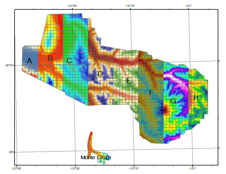 The small bare-earth DEM tiles were mosaicked into strips labeled A-H,